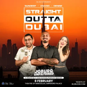 STRAIGHT OUTTA DUBAI: JOBURG UNFILTERED is a must-see stand-up comedy show! Featuring Dubai-based comedians Anand, Sundeep and Denise, the show combines high-energy stand-up comedy with a live comedy podcast experience, offering audiences something new, interactive and completely unfiltered. Perfect for comedy lovers, this show delivers bold humour, cultural commentary and laugh-out-loud moments in one unforgettable night.